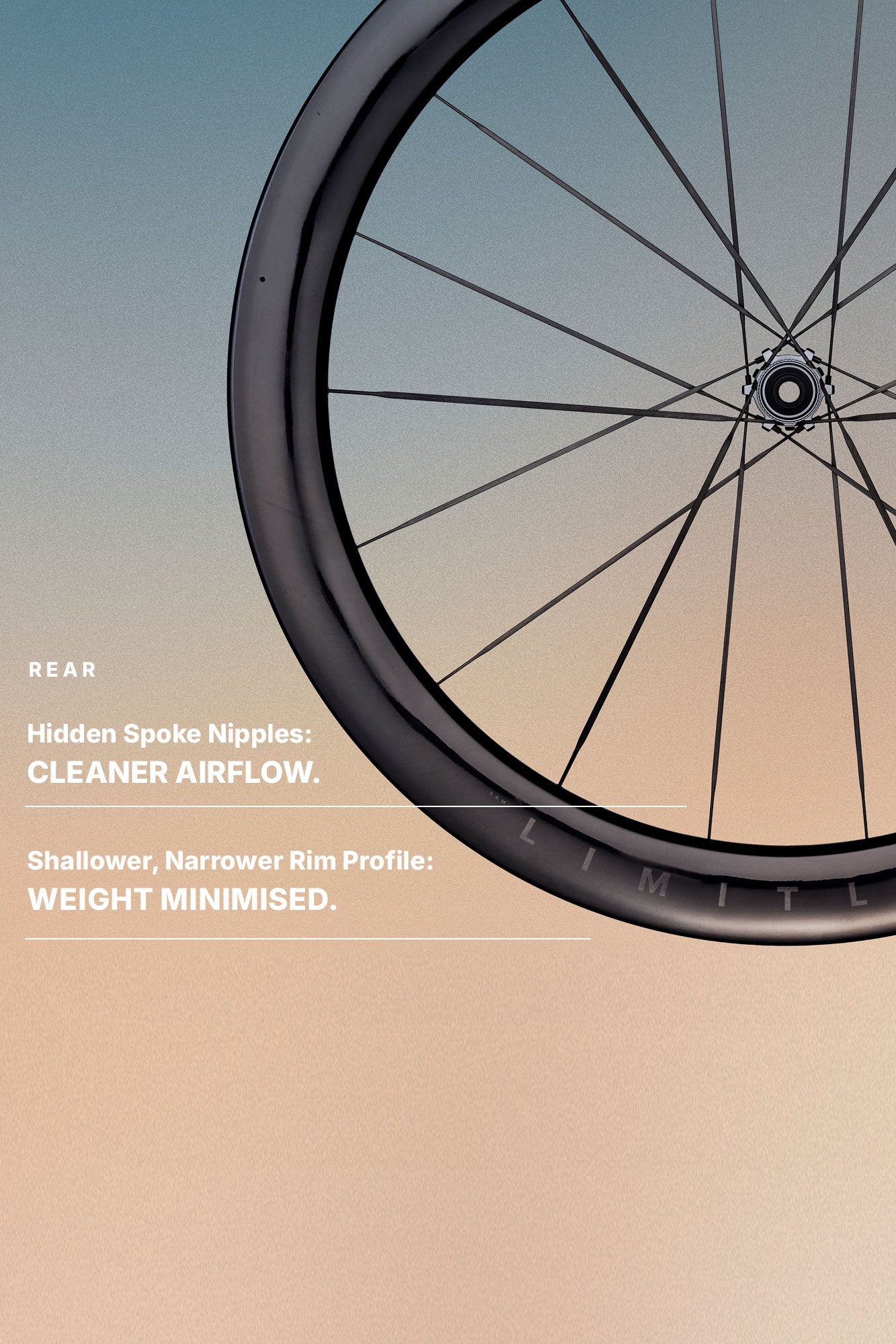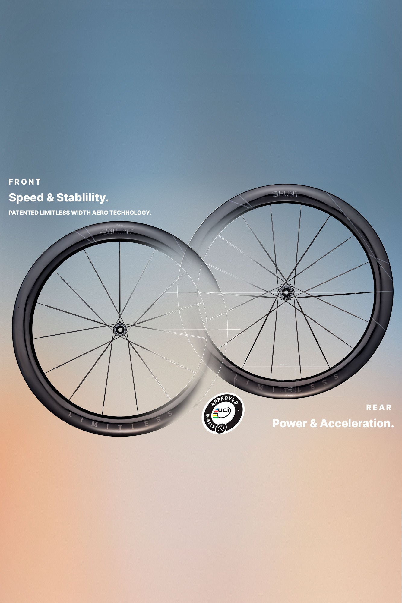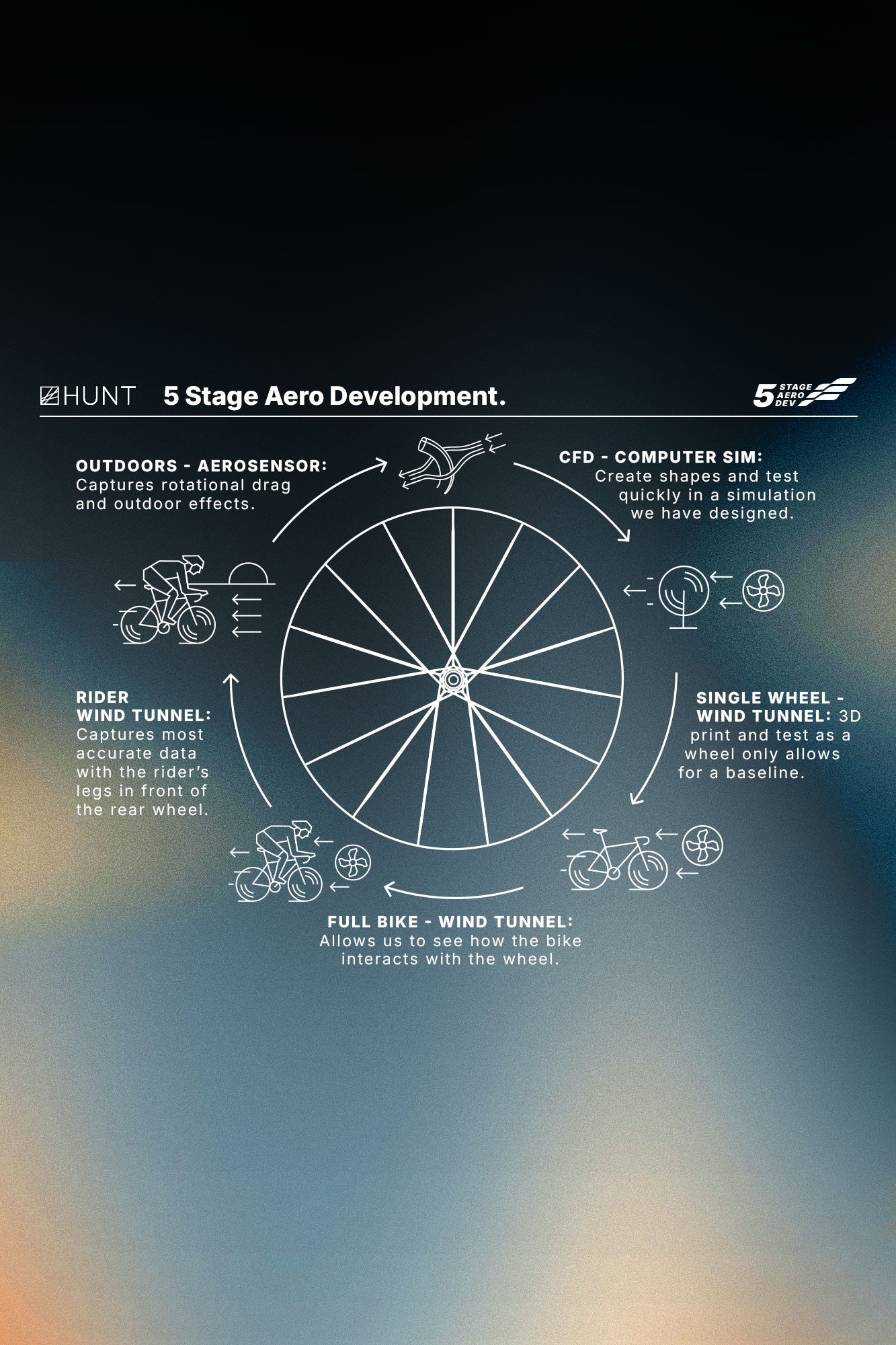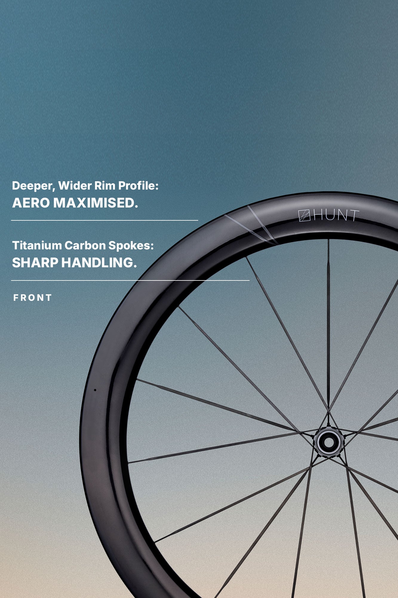 Rims58mm deep front rim profile with a 34.5mm external width. 55mm deep rear profile with a 30mm external width. Hooked 23mm internal profile. Compatible tyres ranging from 28-50mm to be fitted including tubeless or clincher tyres in line with ETRTO guidelines. Aerodynamically optimised for a 28-30mm tyre. Unique carbon fibre layup strategy, comprised of T700, T800, T1000 and a High Modulus Pyrofil HR4012M carbon. Pre-formed 3D spoke reinforcement. Designed by HUNT’s in-house Engineering Team using Computational Fluid Dynamics (CFD) and then validated using wind tunnel testing. High gloss finish unidirectional carbon fibre rim.