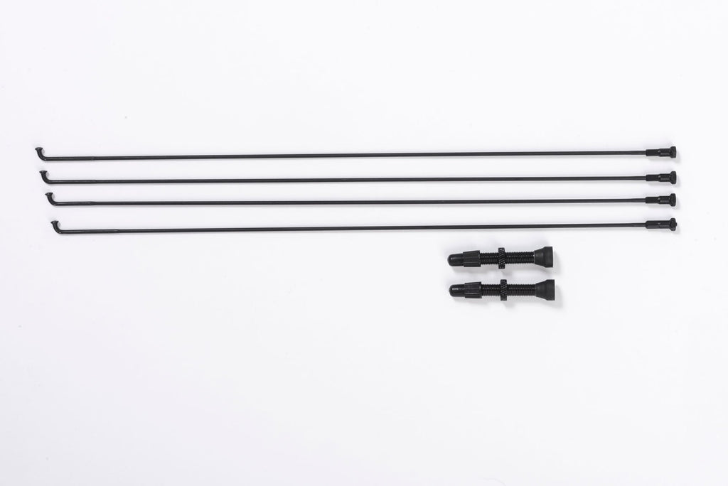 SpokesJ-bend cold drawn. 28F/32R spoke count, 3 cross. Made from high grade T302 (18/10) stainless steel wire by Sandvik Sweden. Triple butted 2.0-1.8-2.0 (then 2.2 at the head for the patented Pillar Spoke Re-enforcement). Black stainless treatment.