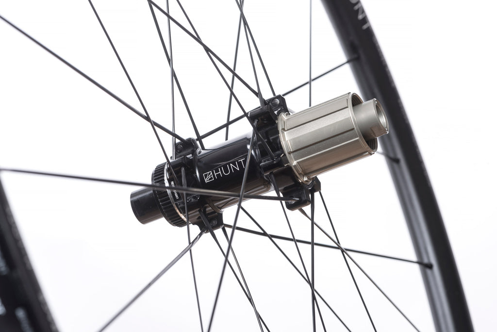 Rear Hub7075-T6 heat-treated aluminium alloy freehub body Steel Spline Insert freehub body reinforcement provides excellent durability against cassette sprocket damage to the freehub often seen on standard alloy freehub bodies 3x treble-tooth individually leaf sprung pawls with 48 teeth on the ratchet ring for fast 7.5 degree engagement and instant acceleration. Hunt Race Season Disc straight-pull super-light alloy. Forged and CNC’d 6061-T6 heat treated aluminium alloy body. 7075-T6 aluminium alloy axles. Center-lock disc mount. If you require a 6 bolt adaptor you can purchase separately here Polished anodized black finish with laser graphics.
